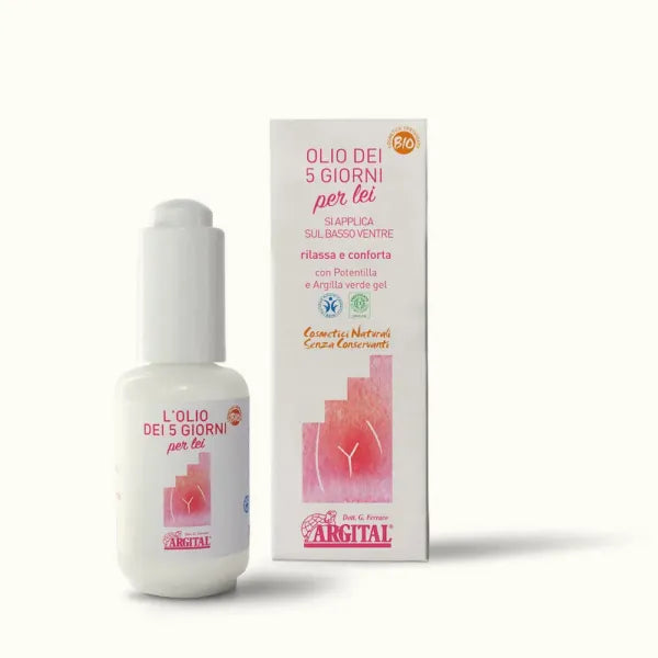 L’Olio dei 5 giorni è stato studiato per rilassare e confortare durante i 5 giorni del mese, nei quali la donna è maggiormente esposta. Tali benefici sono dovuti principalmente all’azione della Potentilla e del gel di Argilla verde e in secondo luogo alla presenza delle altre erbe officinali contenute nell’Olio dei 5 giorni. Gli estratti di Potentilla, Salvia, Ortica Bianca, Uva Ursina, svolgono un’azione rilassante attenuando i fastidi legati al periodo dei 5 giorni.